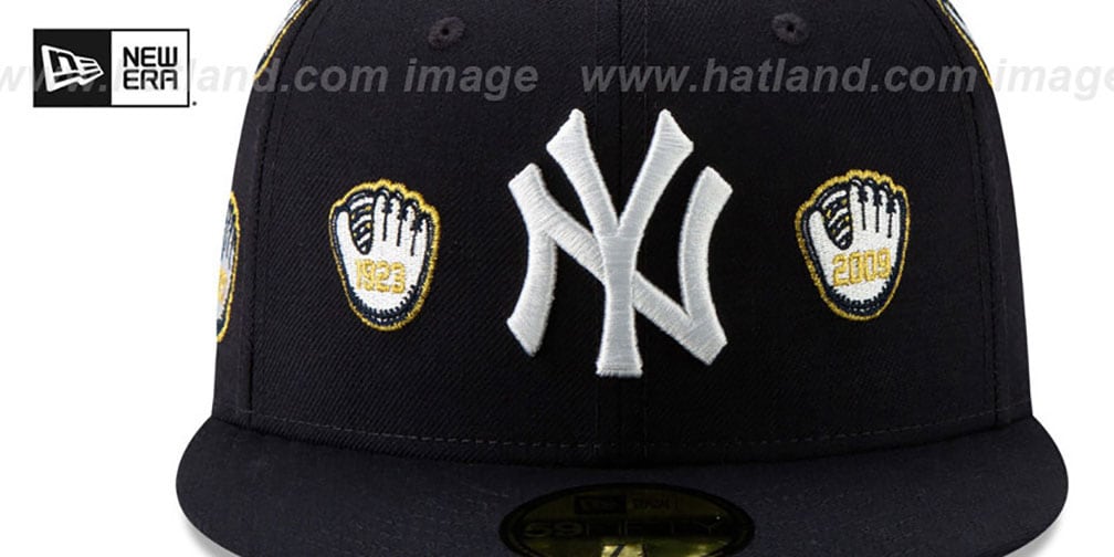 Authentic and ORIGINAL 59FIFTY fitted hat by New Era, team color navy blue wool deep crown and visor, throwback kelly green undervisor, raised embroidered NY team logo on front, baseball gloves in white and navy with metallic gold outline and with years winning the World Series in metallic gold embroidered All-Over deep crown and visor, embroidered MLB logo on back