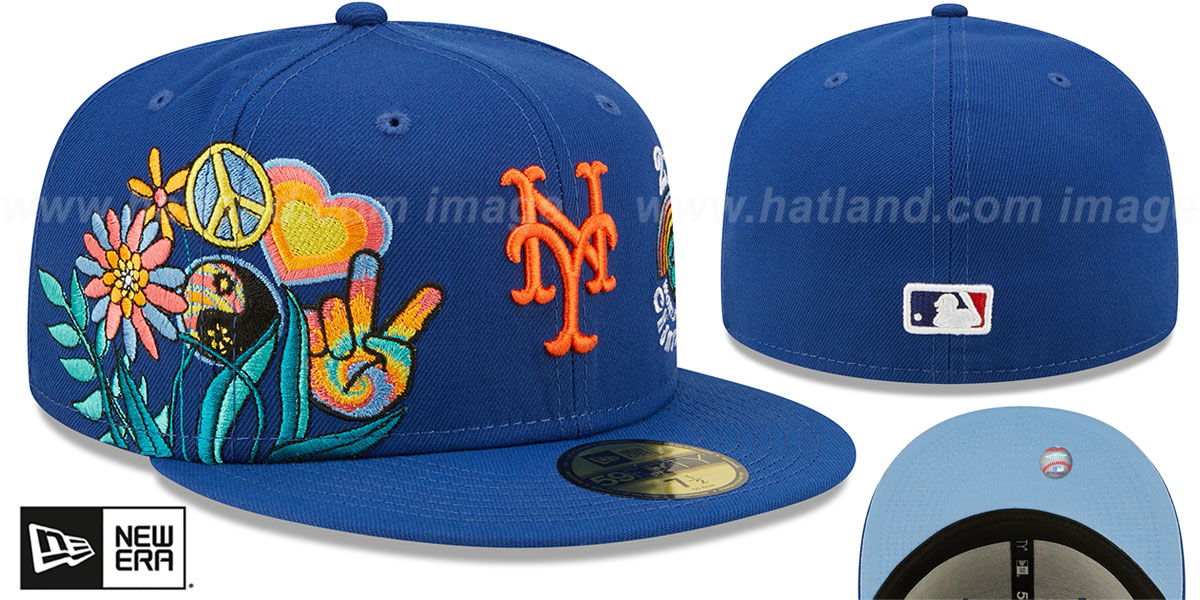 Authentic and Original 59FIFTY fitted hat by New Era, team color royal blue authentic poly crown and visor, sky (light) blue undervisor, raised embroidered team logo on front with embroidered peace signs, hearts, and flowers around side, 2X WORLD SERIES Groovy embroidery to side of team logo, New Era embroidered logo on side, raised MLB logo on back