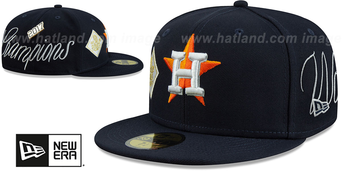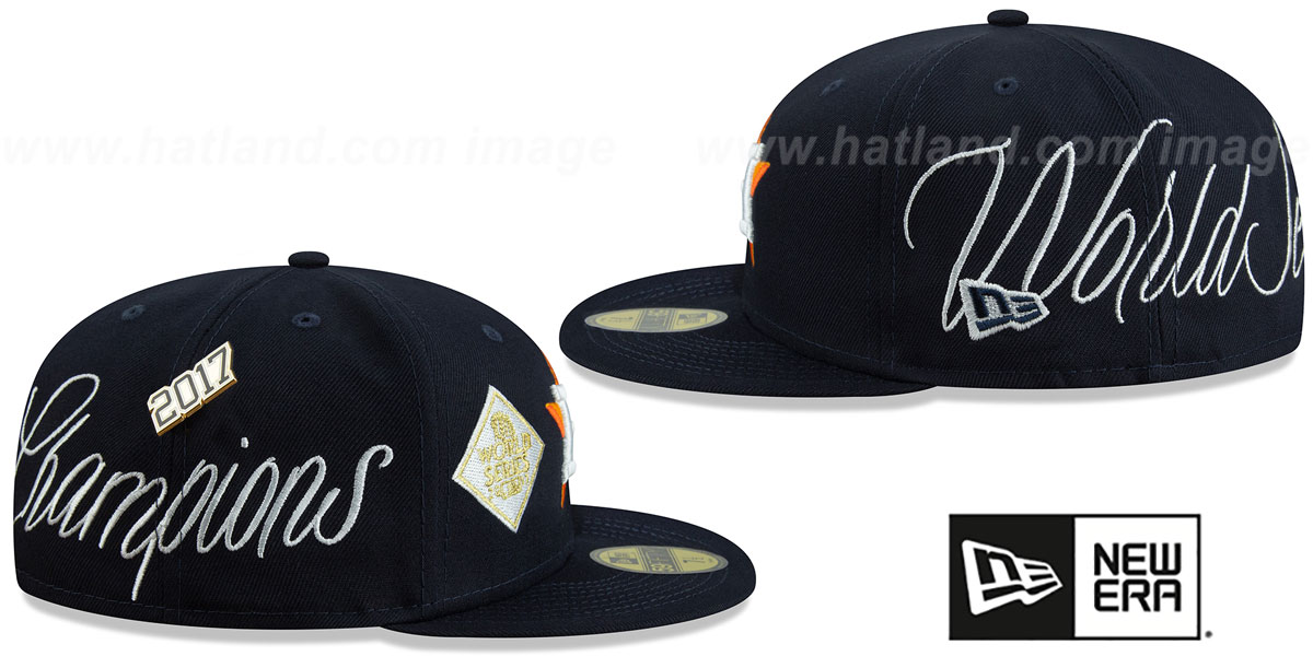 Authentic and Original 59Fifty fitted hat by New Era, dark navy blue authentic poly crown and visor, light grey undervisor, raised embroidered team logo on front with 2017 World series logo to side of logo, 2017 pin on side for the Astros Championship, large World Series Champions script in white around back four panels, raised embroidered MLB logo on back