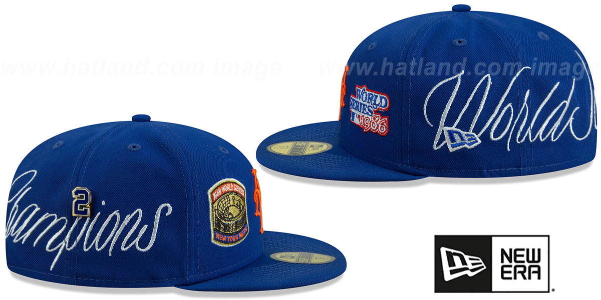 Authentic and Original 59Fifty fitted hat by New Era, royal blue authentic poly crown and visor, light grey undervisor, raised embroidered team logo on front with World series logos on each side of logo, #2 pin on side for each Championship, large World Series Champions script in white around back four panels, raised embroidered MLB logo on back