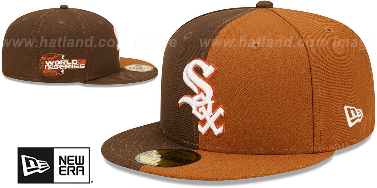 Authentic and Original 59Fifty fitted hat by New Era, split authentic poly crown and visor with one side brown and one side wheat (panama tan), light wheat undervisor, black sweatband, matching raised embroidered team logo on front, matching embroidered 2005 World Series logo side-patch on side, embroidered New Era logo on opposite side, matching raised embroidered MLB logo on back